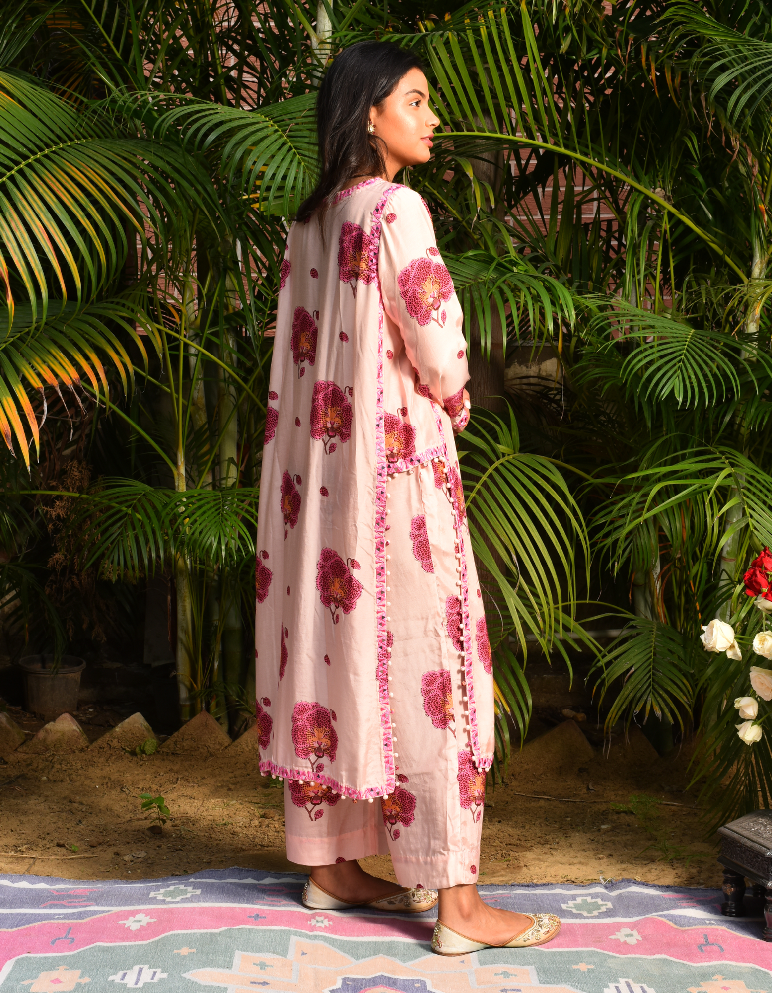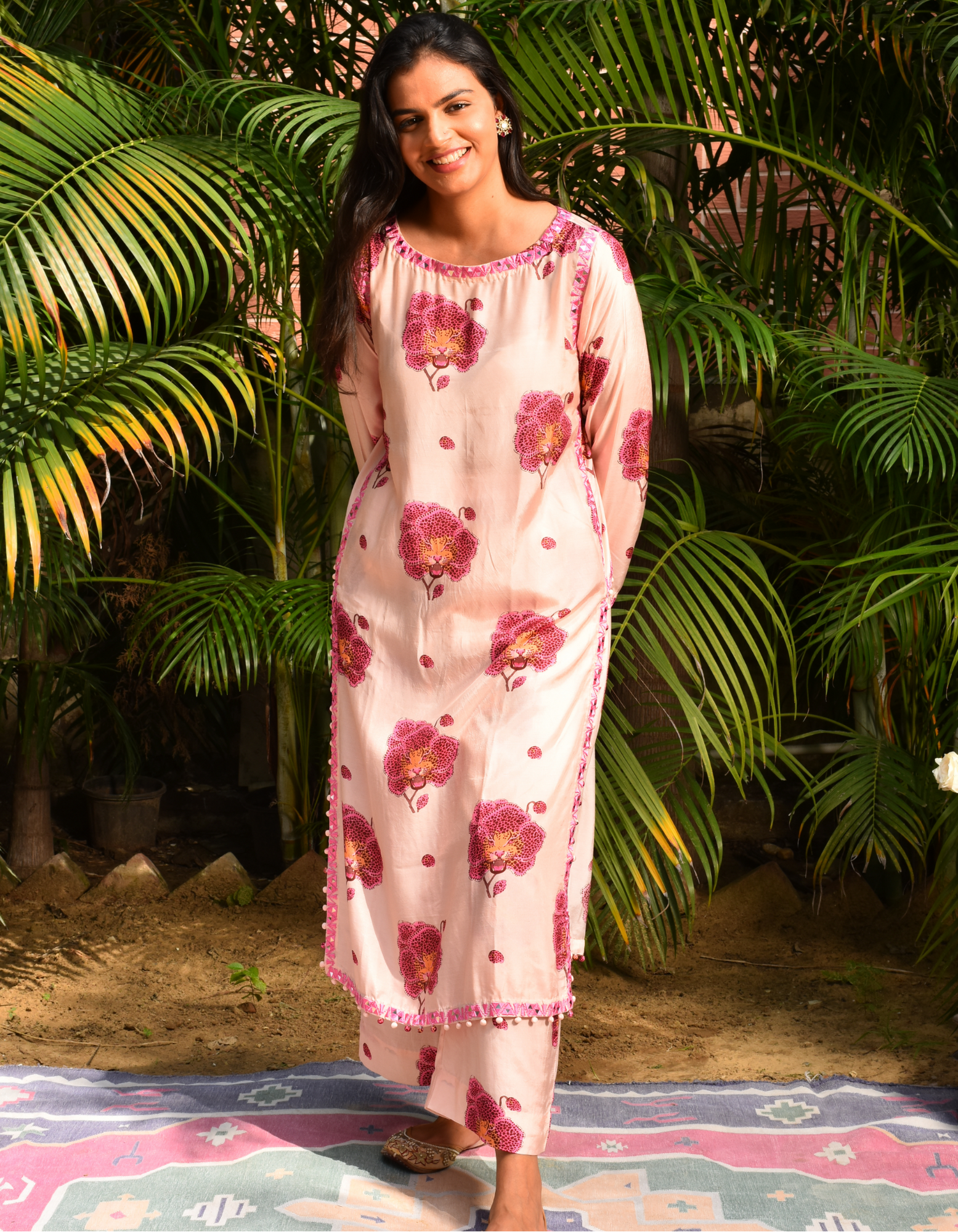 Crafted in soft muslin silk, this set blends comfort with quiet sophistication. The fabric falls effortlessly, carrying a gentle sheen that makes it easy to wear through the day and into the evening. At the heart of its design is a striking motif—a leopard face nestled within a bloom—capturing both the delicacy of nature and the strength of the wild. A piece that feels light on the skin yet makes a statement, it’s perfect for those who like their style to speak with subtle boldness.
