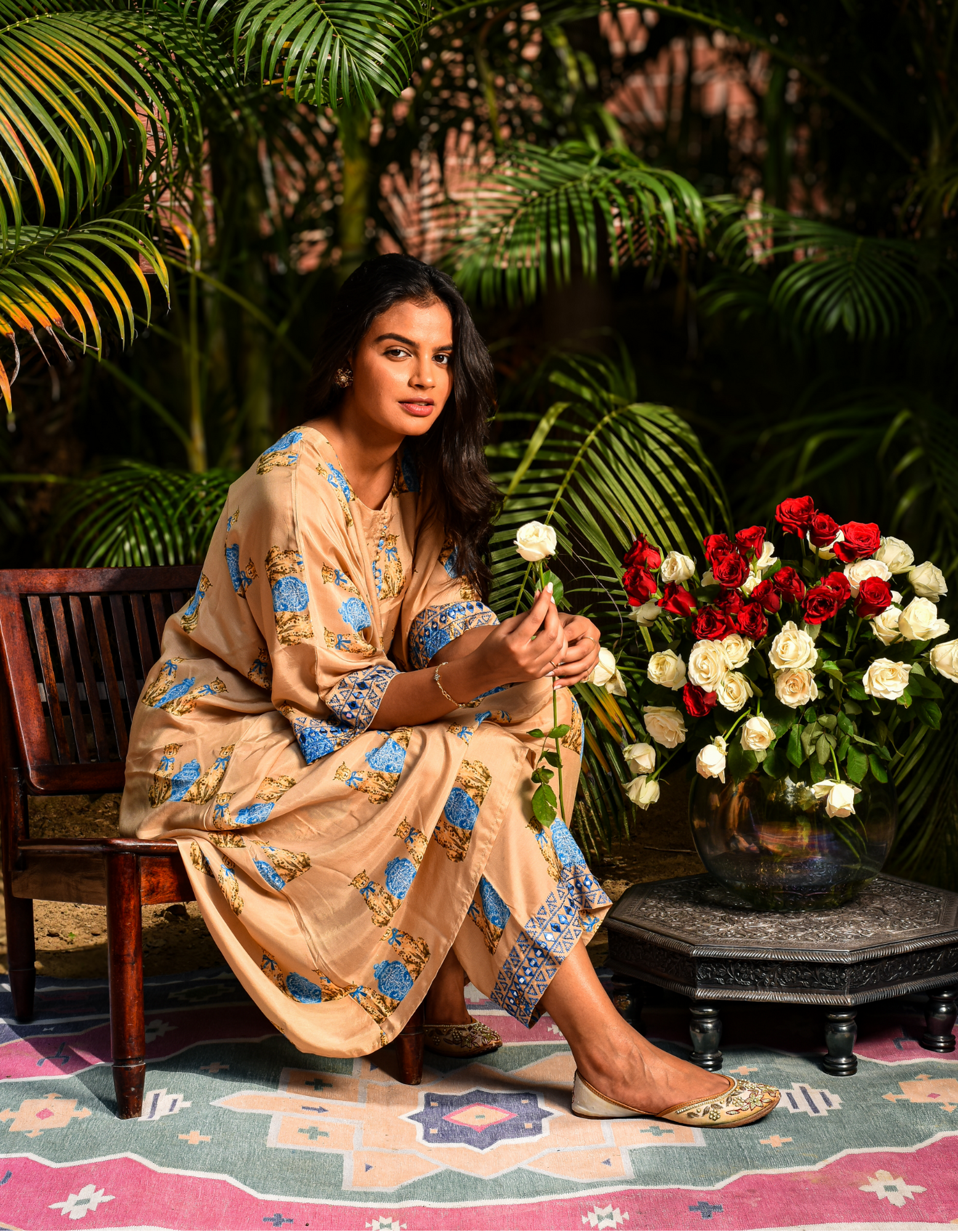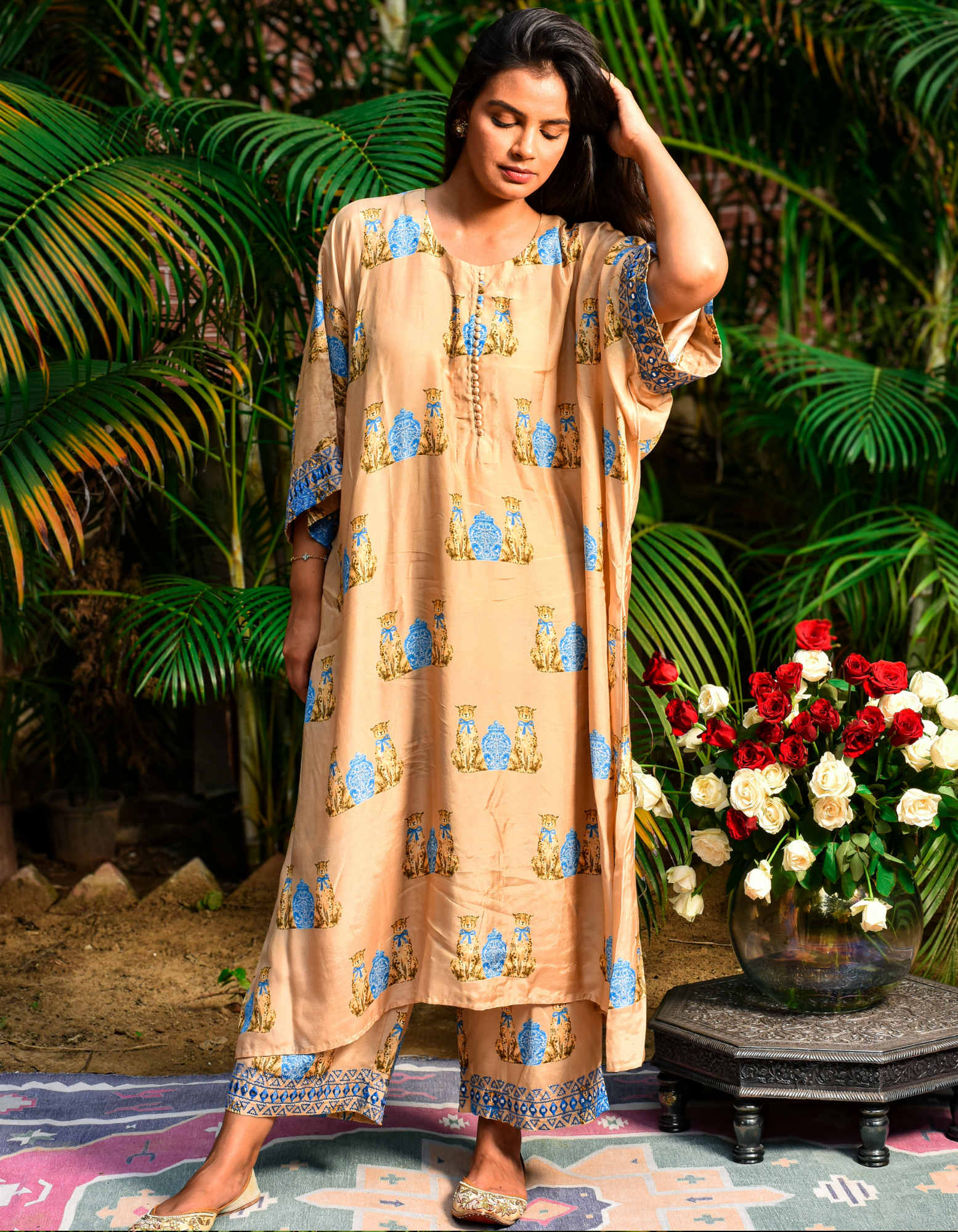 Crafted in soft muslin silk, this set blends comfort with quiet sophistication. The fabric falls effortlessly, carrying a gentle sheen that makes it easy to wear through the day and into the evening. At the heart of its design is a striking motif—a leopard face nestled within a bloom—capturing both the delicacy of nature and the strength of the wild. A piece that feels light on the skin yet makes a statement, it’s perfect for those who like their style to speak with subtle boldness.