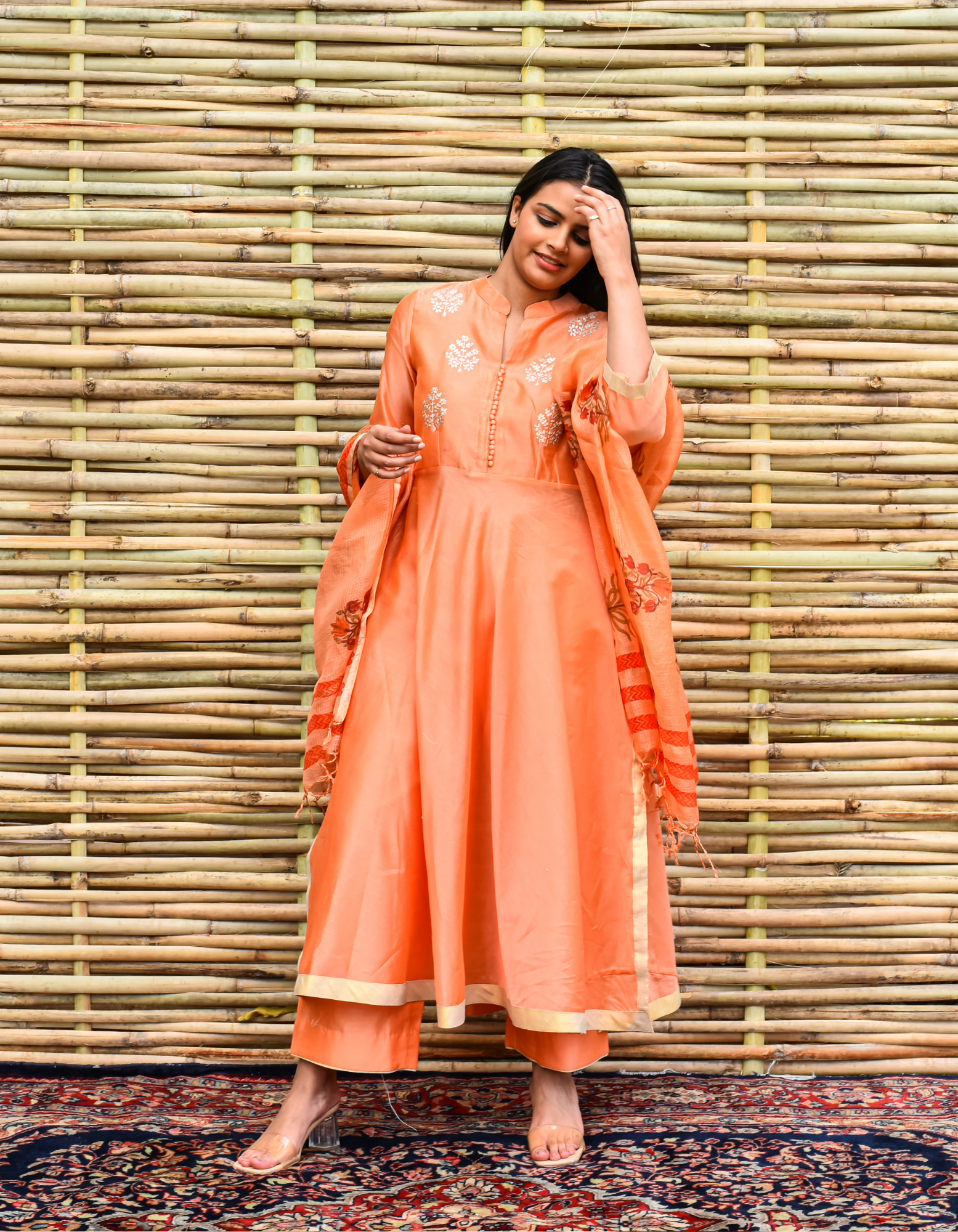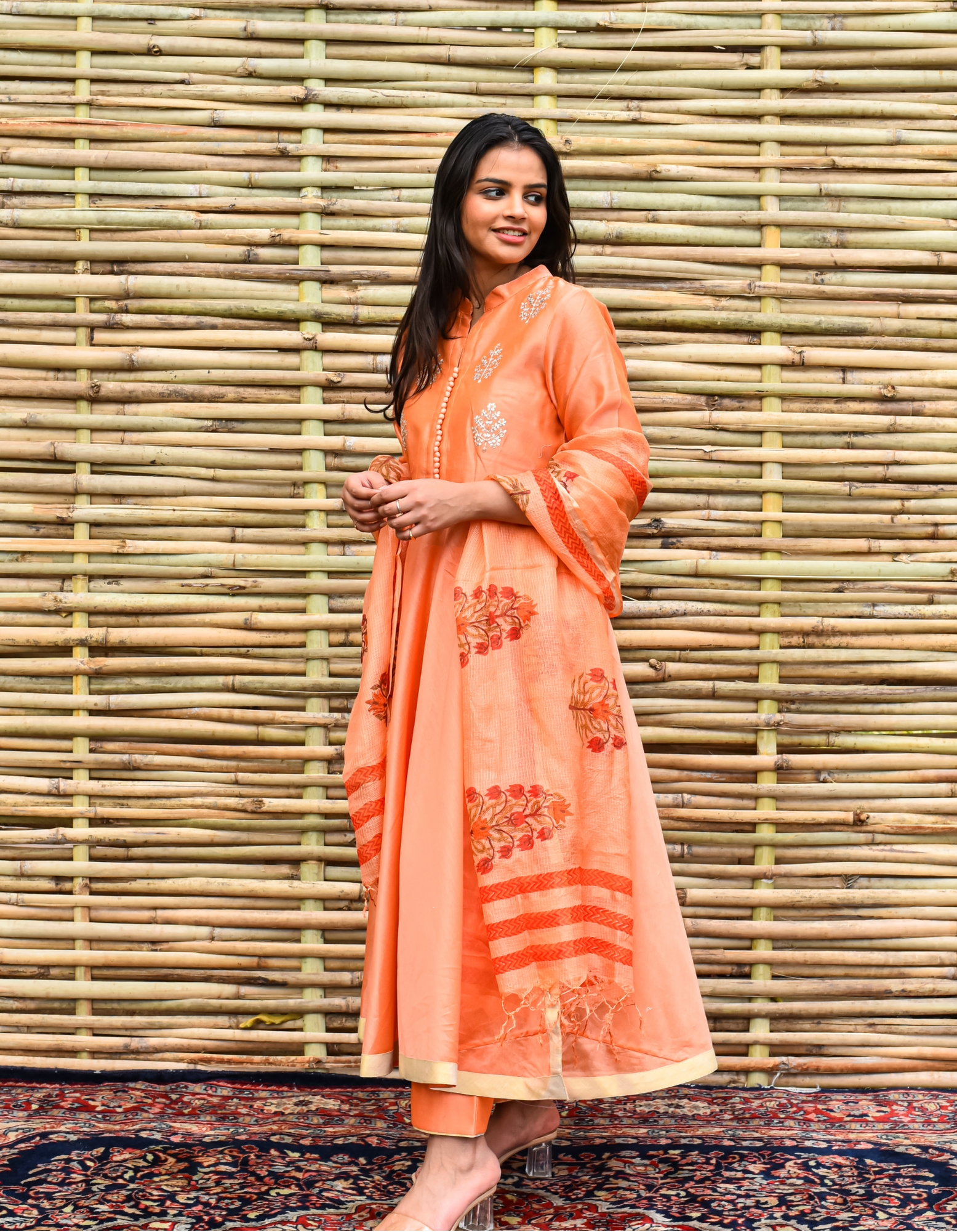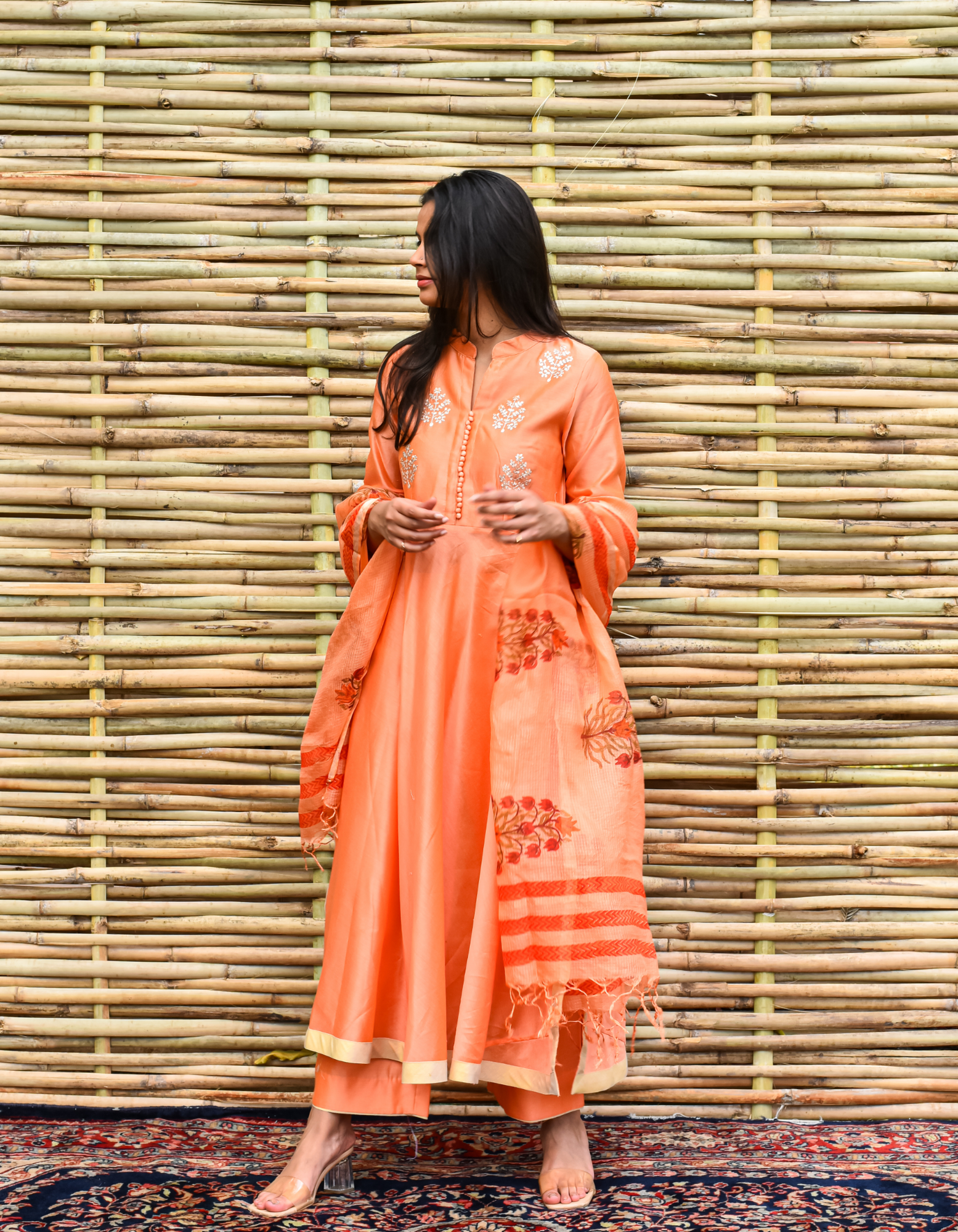 Crafted in elegant beige, the Ziya Chanderi Full Set features a beautifully hand-block printed Kota Doria silk dupatta, adding a touch of artistry to the ensemble. Delicate embroidery on the Chanderi kurta enhances its timeless appeal, making this set a perfect blend of tradition and refined elegance.
